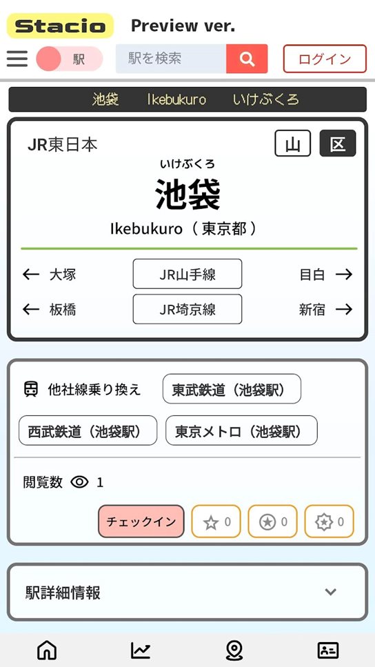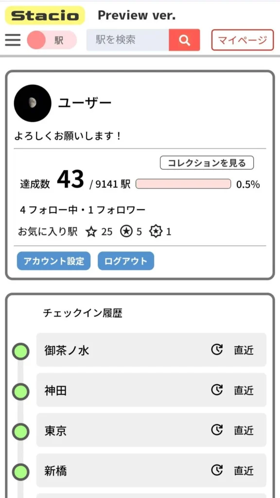 スマートフォンの位置情報を用いて、近くの駅にチェックインすることができます。チェックインした駅はアカウントに保存されます。日常生活で訪れる駅、旅先で訪れた駅を記憶に残すことができます。